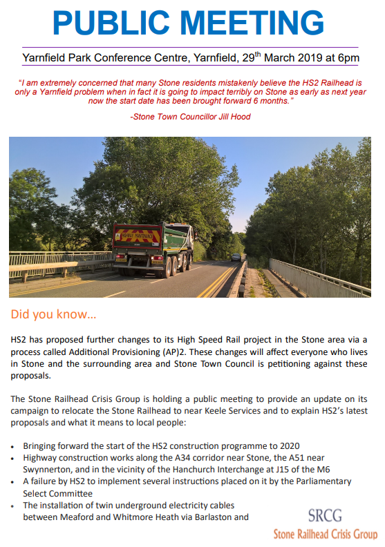 Hello, SRCG are inviting Stone & surrounding residents to a public meeting from 6 – 8 pm on Friday 29th March at Yarnfield Park Conference Centre.