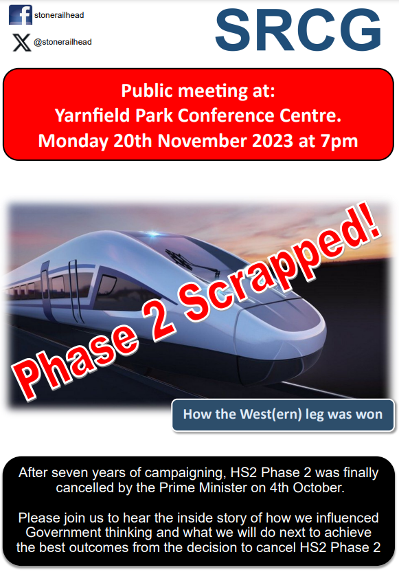 The Stone Railhead Crisis Group (SRCG) will be presenting a campaign update and will include its Annual General Meeting (AGM) on Monday 20th November 2023 at the Yarnfield Park Conference Centre, starting at 7pm.